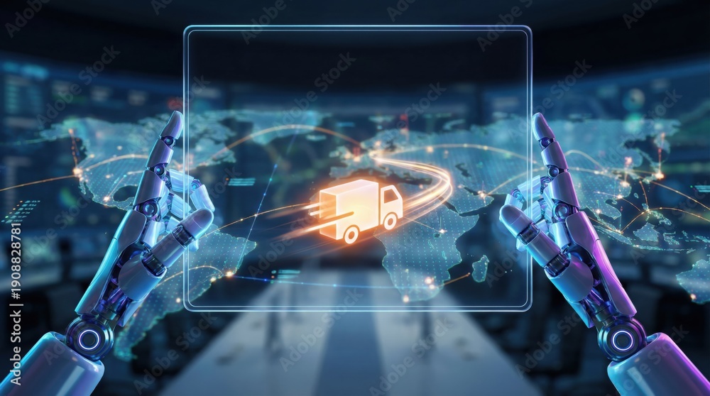 Robotic Hands Managing Logistics Optimization on Virtual Global Map Interface Display with Delivery Truck Icon for Advanced Supply Chain Analytics and Automation Efficiency #1908828781