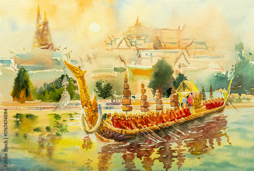 Royal Barge Procession and Grand palace in sun background. Watercolor paintings landscape colorful of architecture and river view. #1767474094