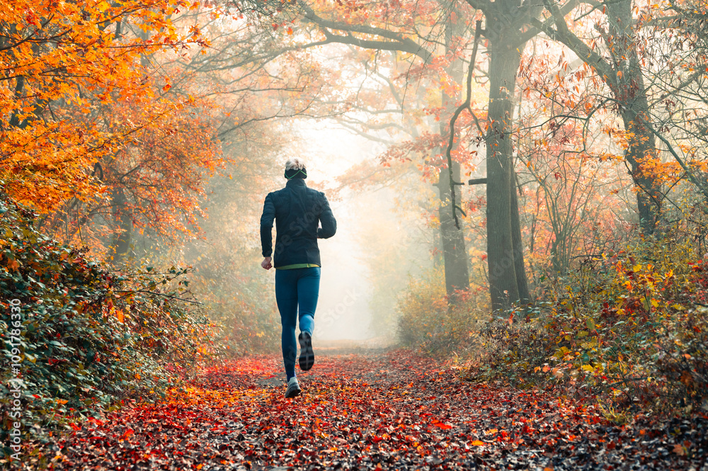 Runner Moving Through a Misty Fall Forest, Inspired by the Colors of the Season #1091786330