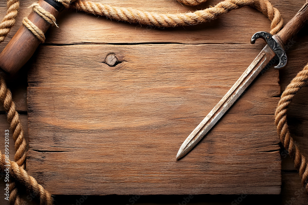 Rustic wooden background with knife and rope for pirate adventure design #1809920183