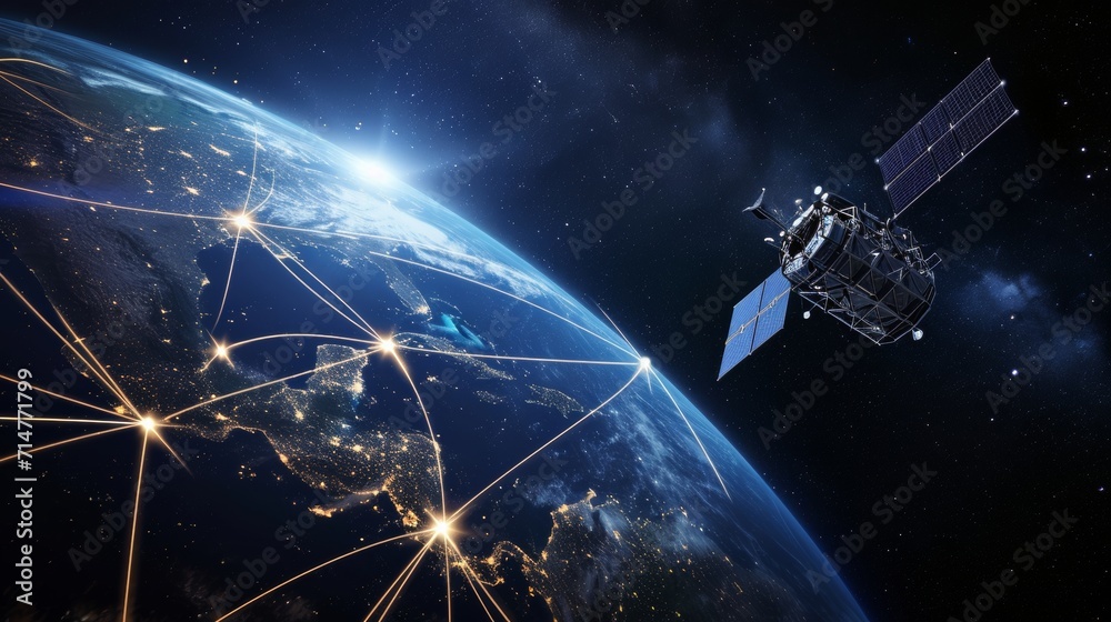 Satellite Orbiting Digital Earth Network. A satellite orbiting Earth with a digital network overlay. #714771799
