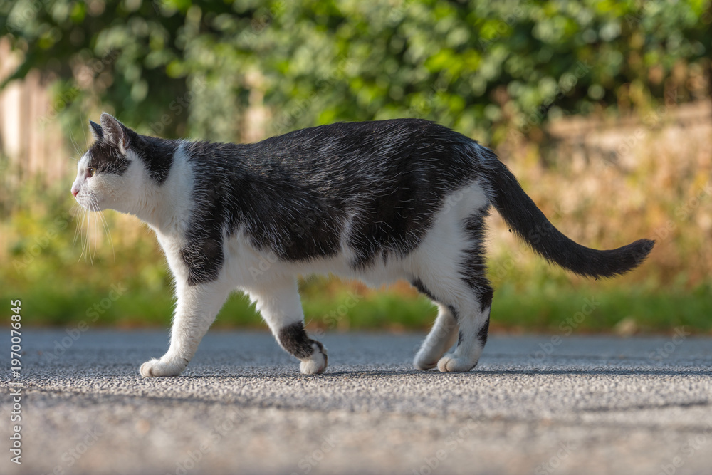 Schwarz-weiße Katze spaziert über Straße #1970076845