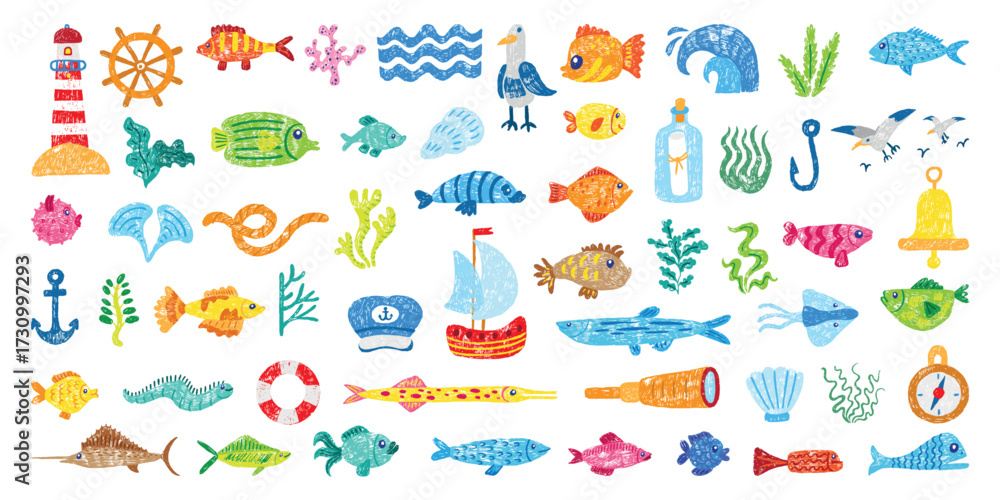 Sea elements crayon style. Ocean travel accessories, fish, seaweeds, shell, anchor, ship, seagulls. Children drawing style colored pencil, neoteric vector clipart #1730997293