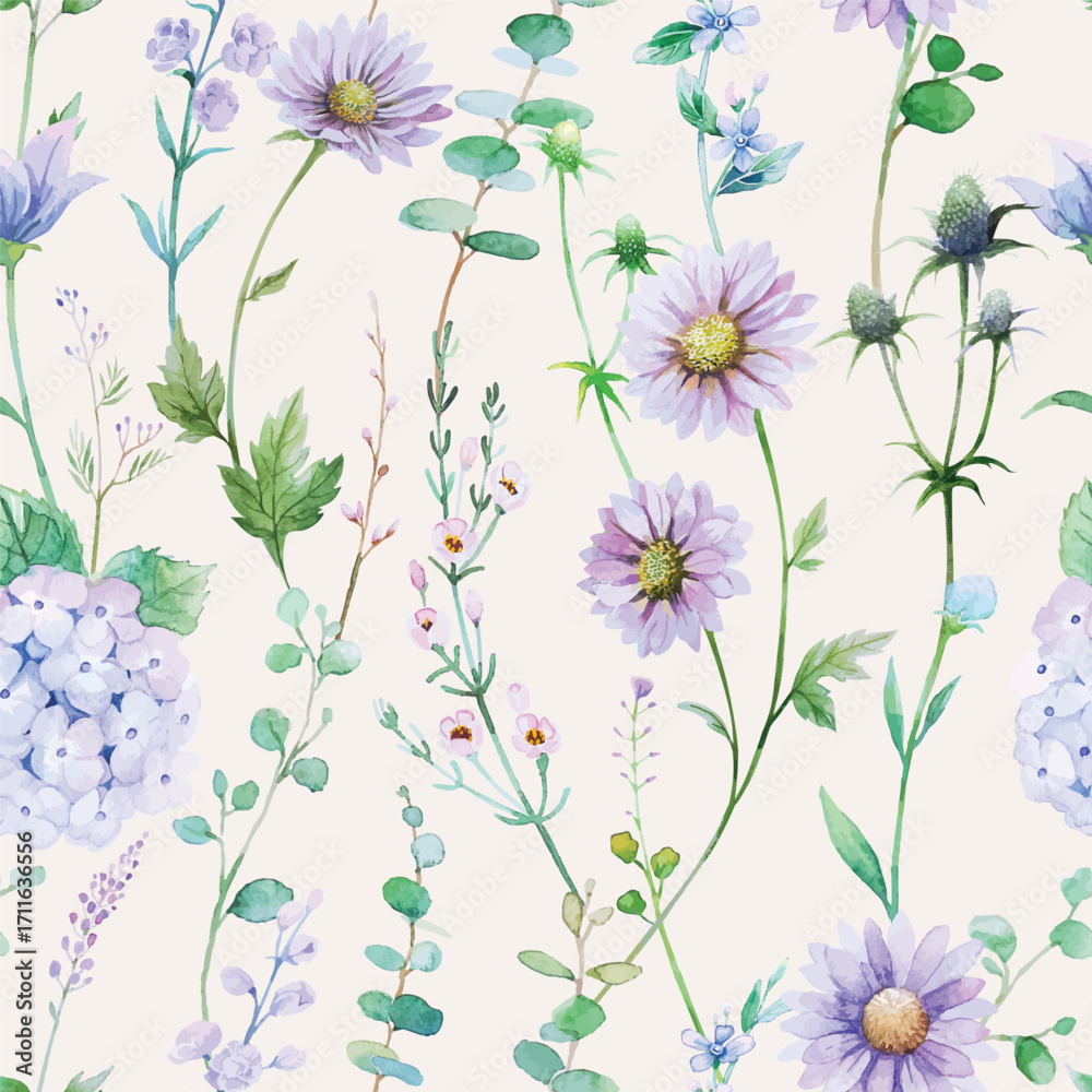 Seamless floral background featuring a variety of wildflowers in a watercolor style. #1711636556