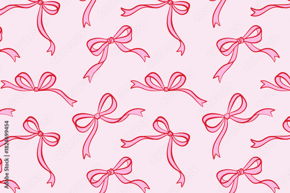 Seamless pattern with hand-drawn pink bows on a light background. Cute decorative design for wrapping paper, textile, wallpaper, packaging, and girly themes. #1824699454