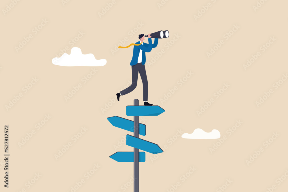 Search for right direction, business opportunity or success way, make decision or career path, vision to see future concept, smart businessman look through spyglass or binoculars to discover solution. #527812572