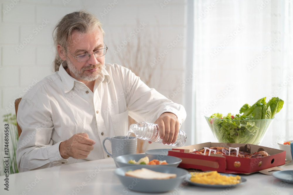 Senior elderly older grandfather stay at home with painful face sitting alone on eating table in house. Depressed elderly retired man upset feeling unhappy. Lonely and missing his family at home #1746816563