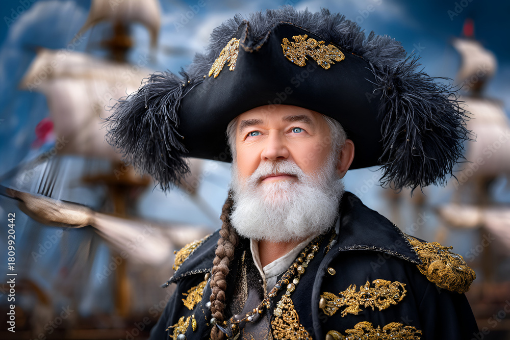 Senior pirate captain in ornate clothing with sailing ships in the background #1809920442