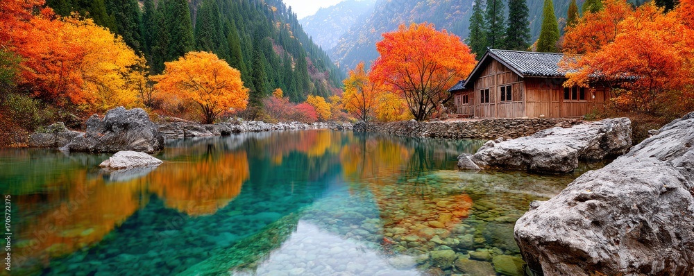 Serene autumn lake with vivid colors and a cozy wooden cabin #1705722375