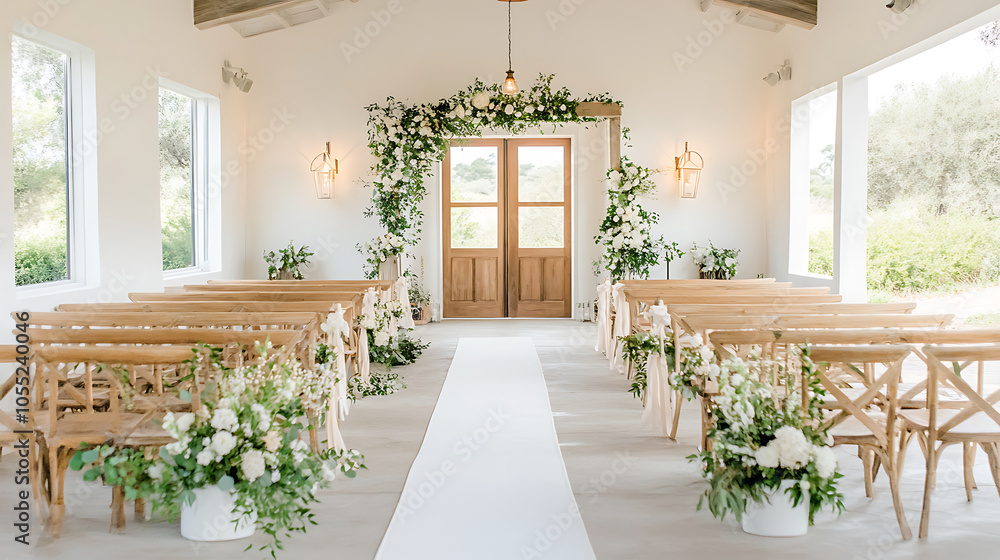 serene wedding chapel aisle adorned with floral arrangements and greenery #1055240046