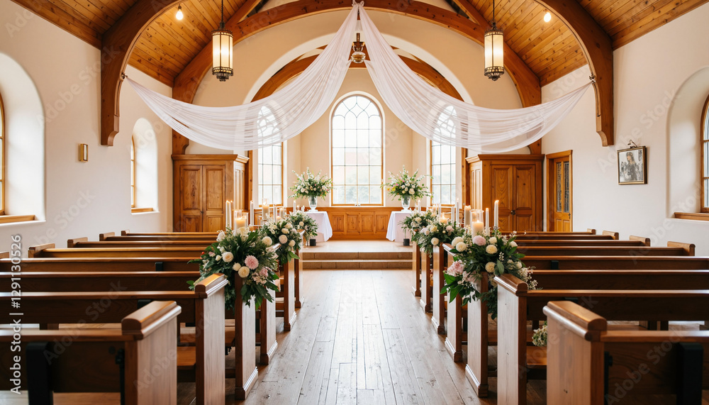 Serene wedding chapel interior with floral decorations #1291130526