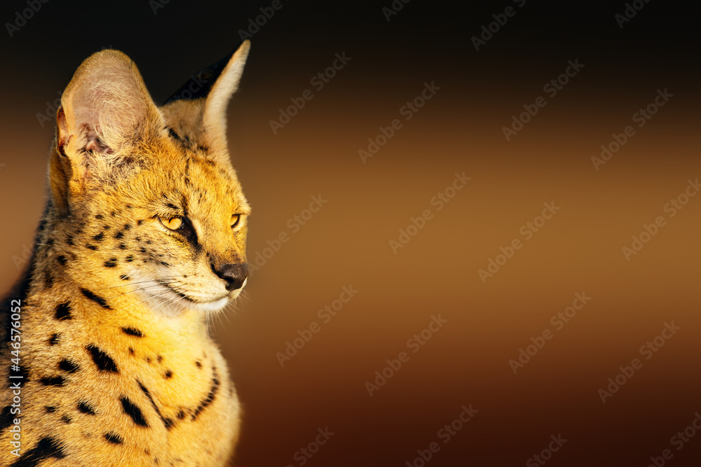 Serval cat close-up portrait in golden light with a clean contrasty background with text space. Leptailurus serval #446576052