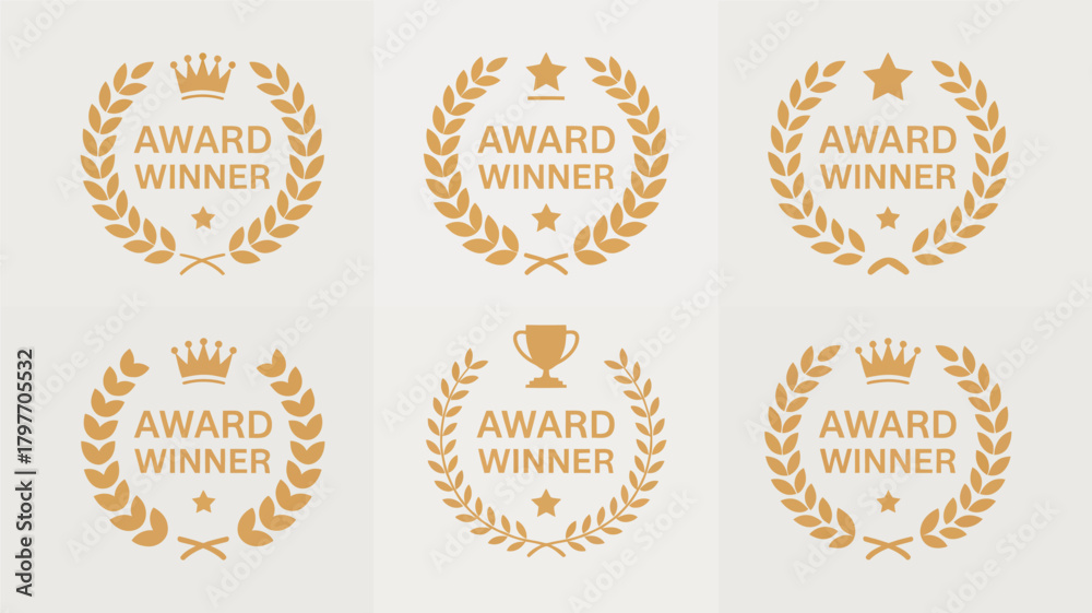 Set of golden award winner emblems featuring laurel wreaths, crowns, stars, and trophies, representing achievement. #1797705532