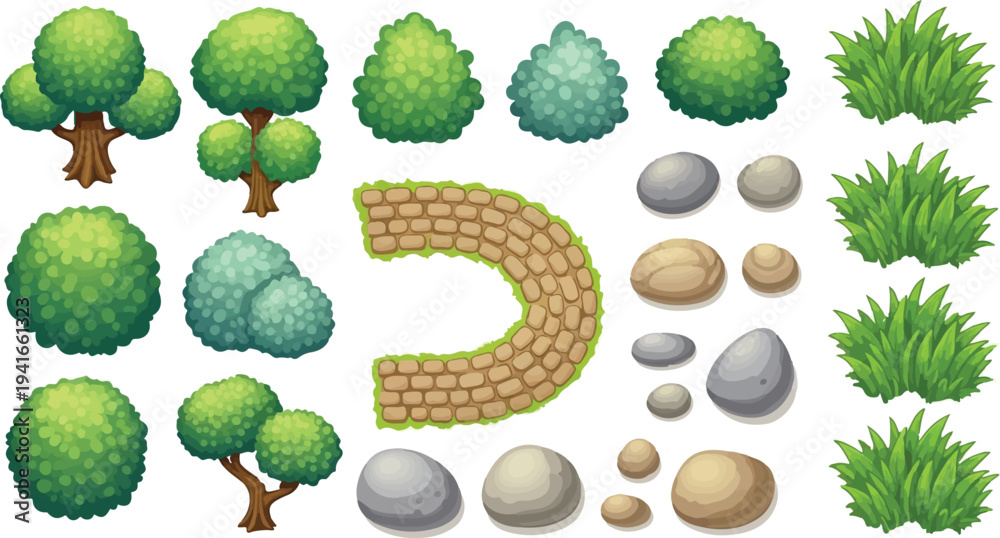 Set of Green Cartoon Trees, Bushes, Grass, Stones, and Cobblestone Path Vector isolated PNG with Transparent Background #1941661323
