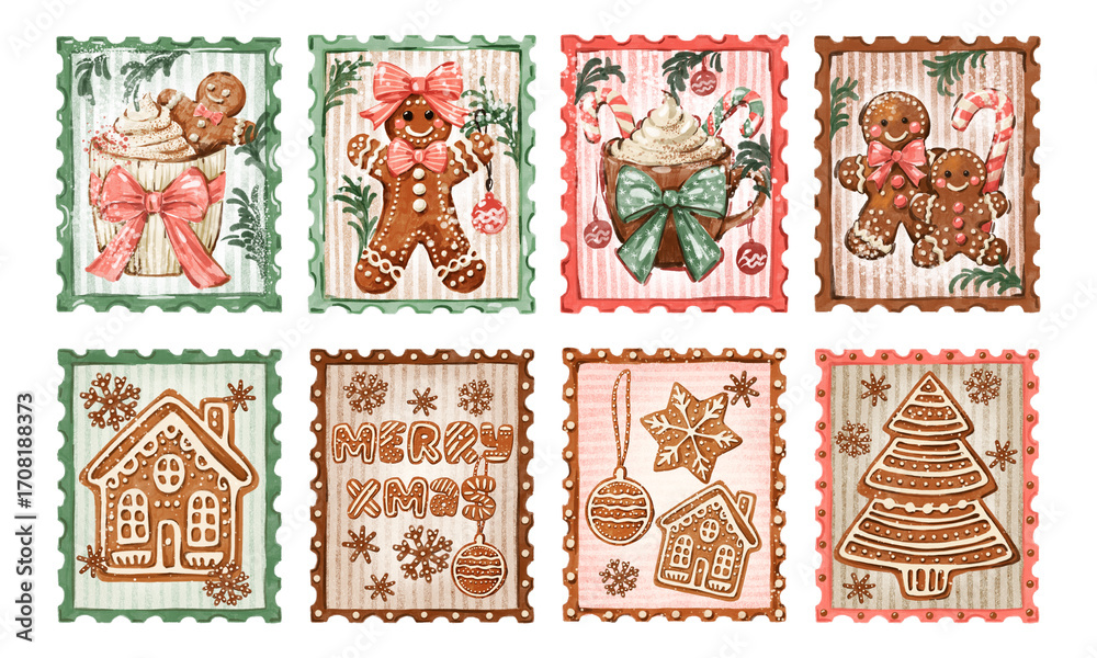 Set of hand-drawn Christmas gingerbread stamps. Festive watercolor illustration collection with cookies, house, and hot chocolate, isolated on white background #1708188373