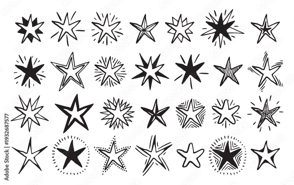 Set of hand drawn star shapes with different outlines and rays. Black and white vector doodle collection isolated on white background. Celestial and decorative element concept for design, pattern, or #1932687577