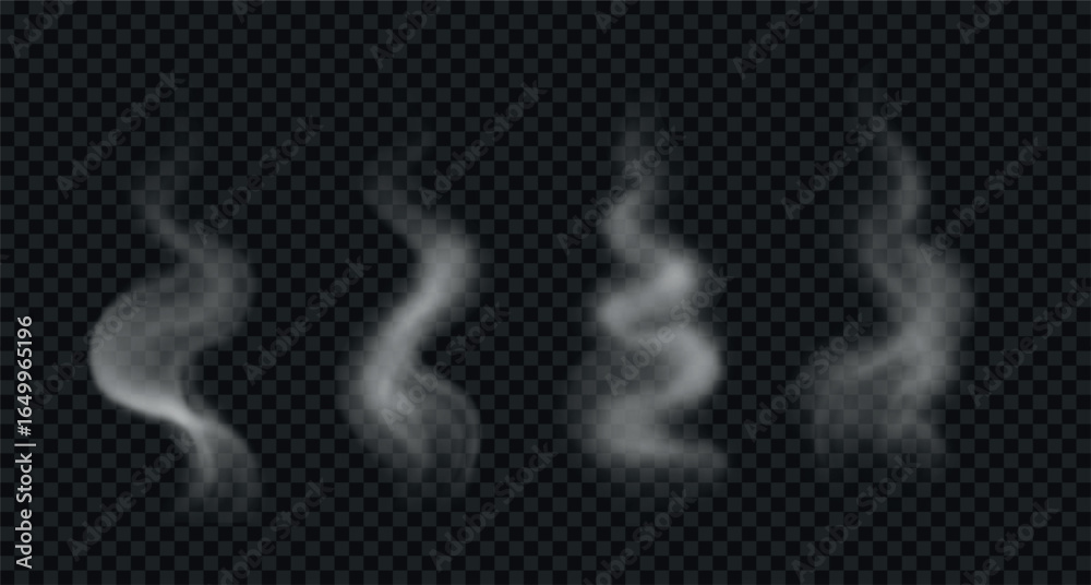 Set of realistic wavy smoke, steam from hot food and drinks. Vector swirl, white vapor isolated on transparent background #1649965196