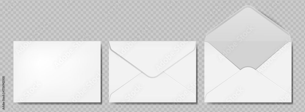 Set of white envelopes. Blank envelope template of standard size. Design for mailing, office documents. Realistic vector illustration on transparent background. #1756942000