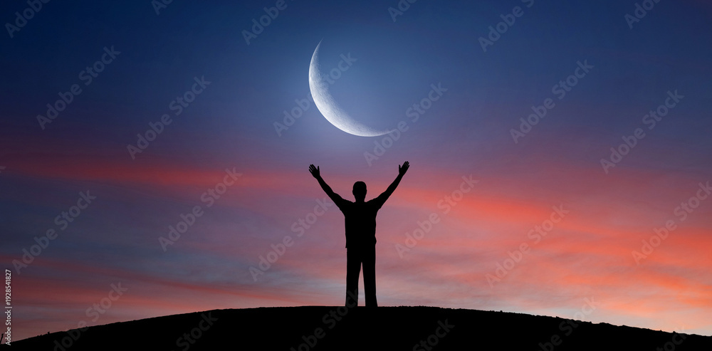 Silhouette of a man with raised hands standing on a hill under a crescent moon at sunset. Elements of this image furnished by NASA. #1928541827