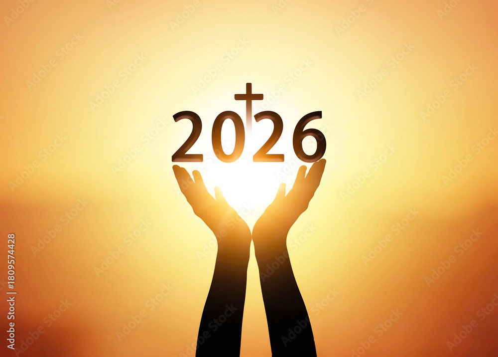 Silhouette of hands holding new year 2026 on sunset background. #1809574428