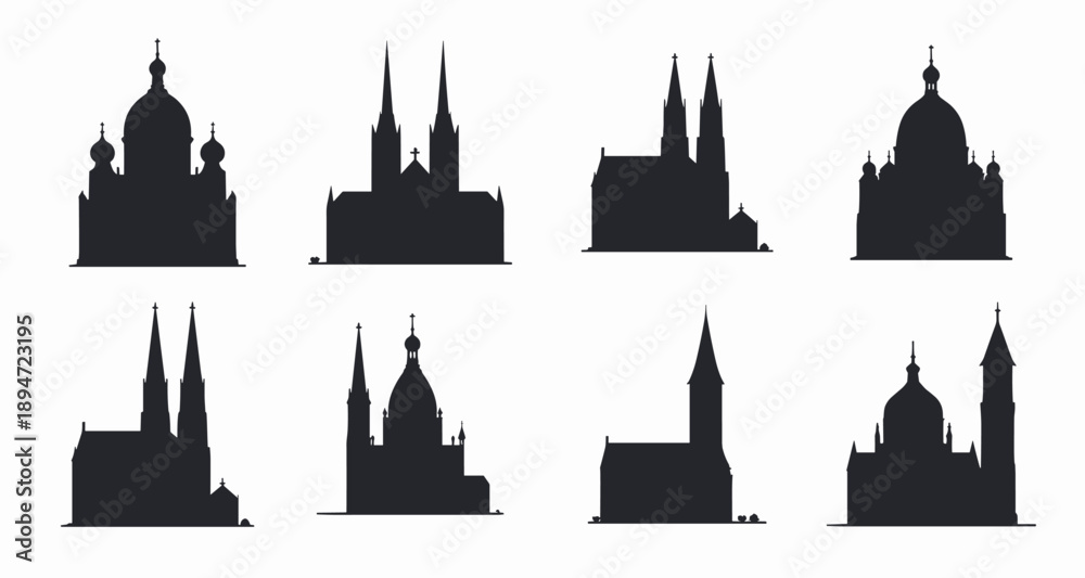 silhouettes of various gothic and baroque church structures #1894723195