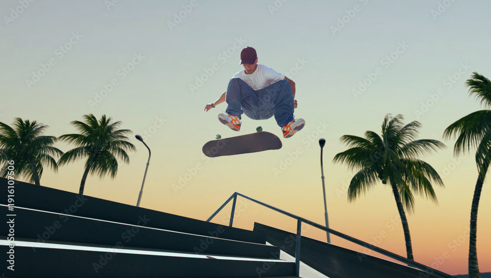 Skateboarder doing a trick in a skate park on sunset. #1916107506