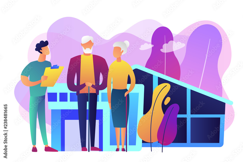 Skilled nurse and elderly people getting around-the-clock nursing care. Nursing home, nursing residential care, physical therapy service concept. Bright vibrant violet vector isolated illustration #238481665
