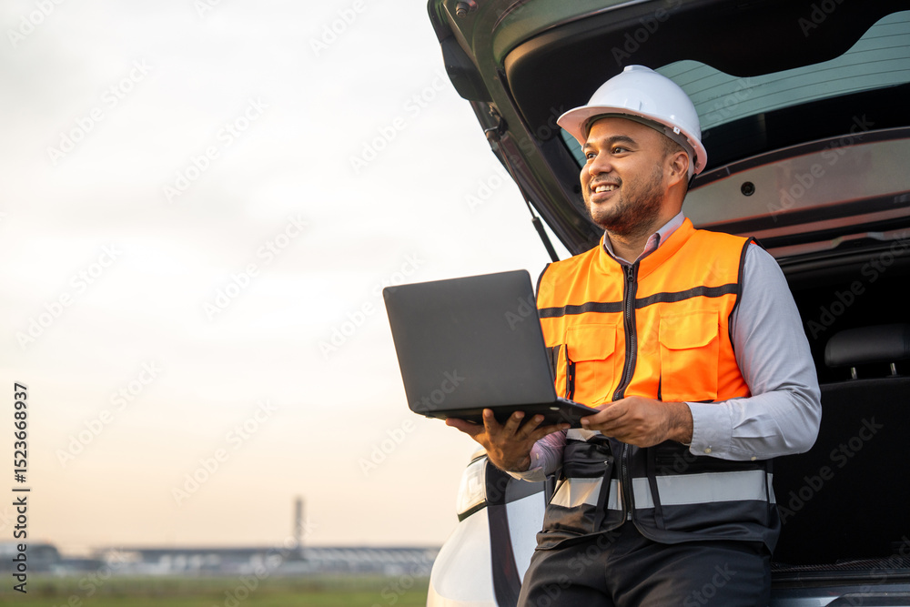 Smart engineer wearing safety uniform working with laptop sitting back of the car near airport at night. Maintenance engineer using laptop to checking inspection in night lights of industry background #1523668937