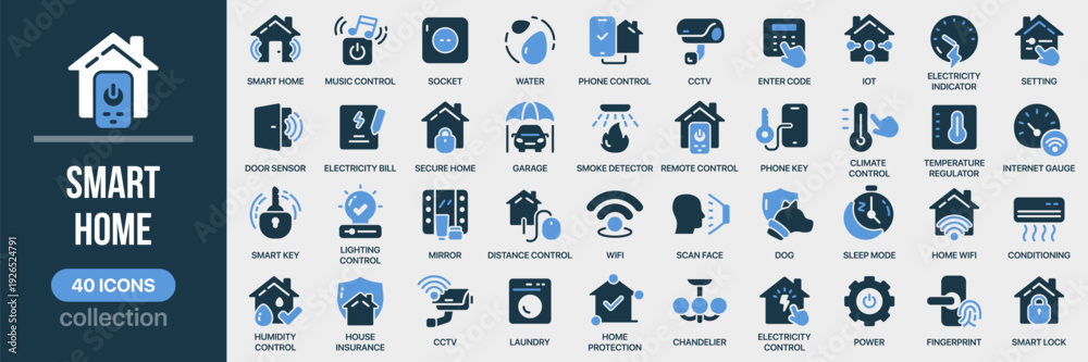 Smart home fill icon collection. Includes wifi, remote control, climate, lighting, CCTV, and security symbols. Created in colored style with blue palette #1926524791