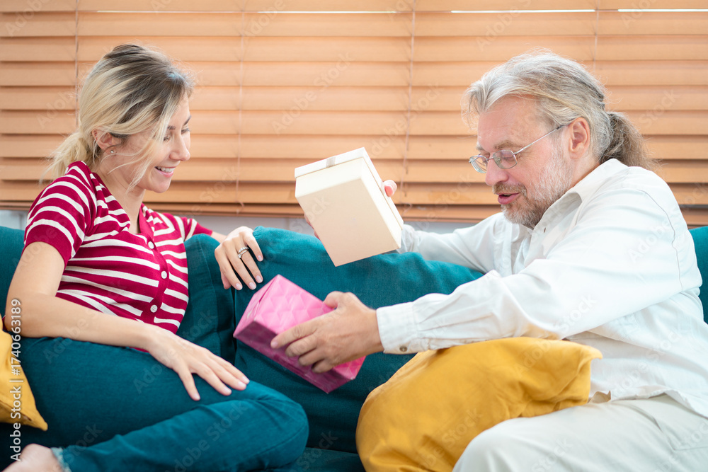 Smiling grandfather and granddaughter with gift boxes sitting on couch at home. Senior father with young woman indoors at home at Christmas, Holding present. #1740663189