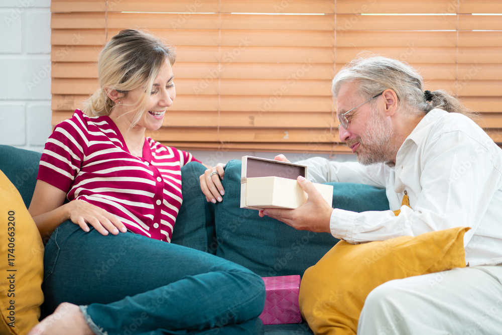 Smiling grandfather and granddaughter with gift boxes sitting on couch at home. Senior father with young woman indoors at home at Christmas, Holding present. #1740663200