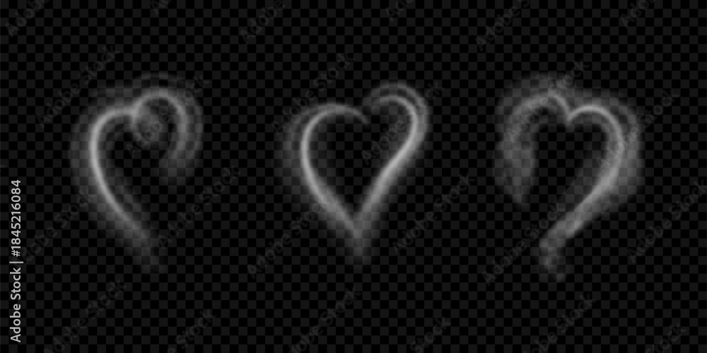 Smoke in heart shape set. Vector white steam with transparency, hot coffee fragrance effect #1845216084