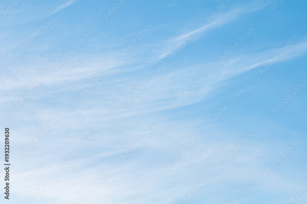 • #1932209630 Soft wispy cirrus clouds stretching across a clear blue sky creating a calm minimalist nature background with gentle textures and copy space