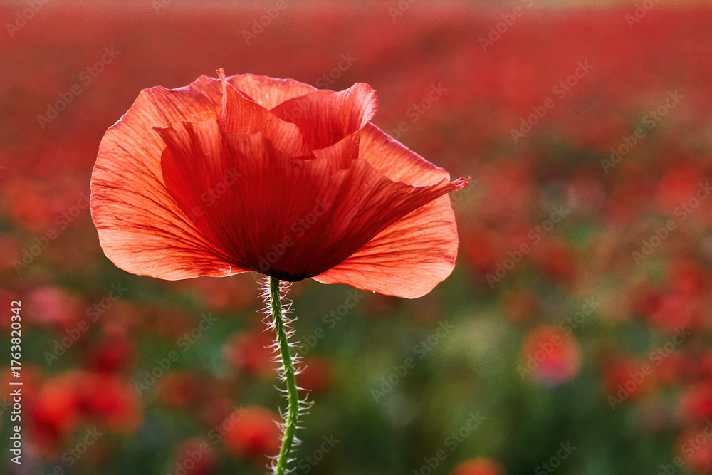 Solitary Poppy in Field. Close-up of a vibrant red poppy blossoming in a lush #1763820342