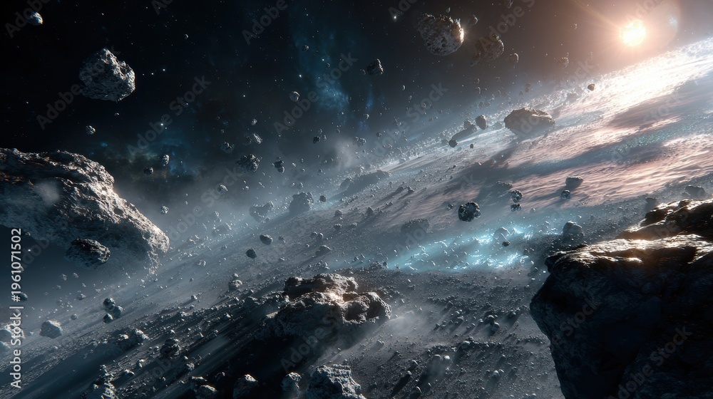 Space universe exploration, fantasy. A vivid, detailed depiction of a cosmic scene. The main subject is a vast expanse of rocky terrain, with numerous asteroids scattered throughout. #1961071502