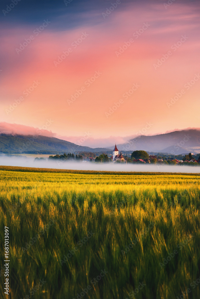 Spring wheat field in the early morning with soft rising sunlight, gentle mist over the countryside, a distant church and rolling hills under a colorful pink sky, vertical nature photograph in pastel #1687013097