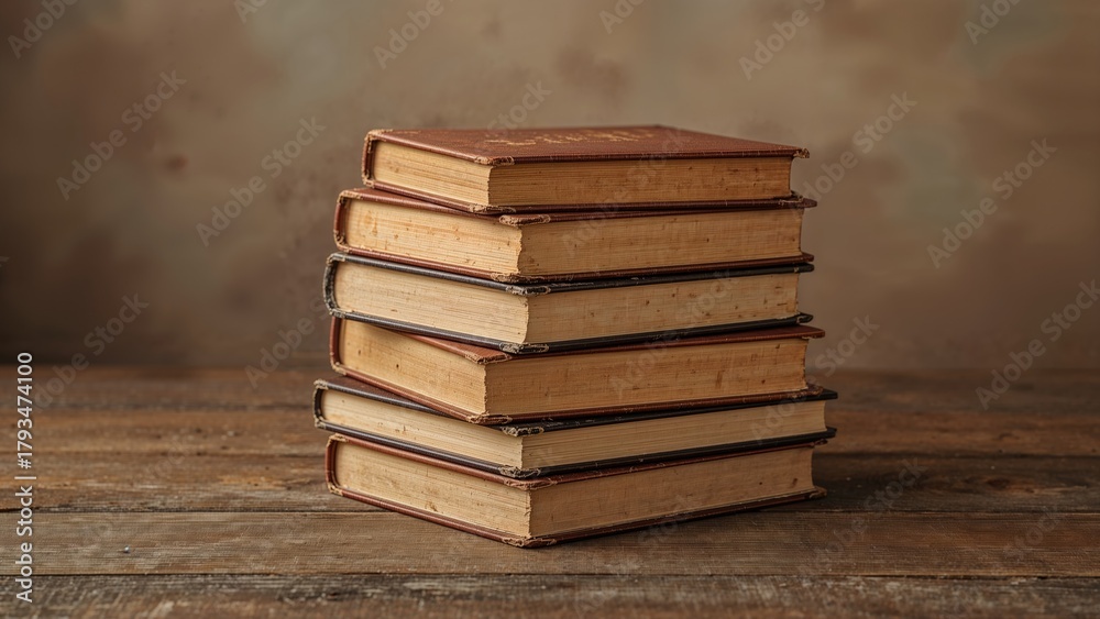 Stack of old books on wooden surface. Vintage literature, knowledge, education, library, reading. Book stack, old books, learning, and literature. #1793474100