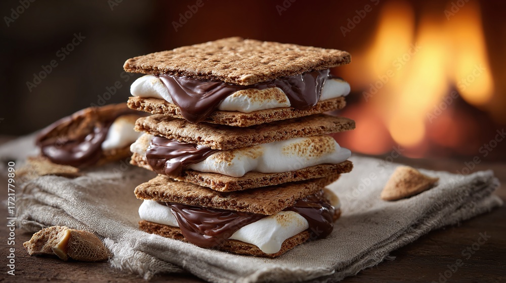 Stacked S'mores: A sweet treat made with toasted marshmallows and melted chocolate between graham crackers, perfect for a cozy campfire night. #1721779890