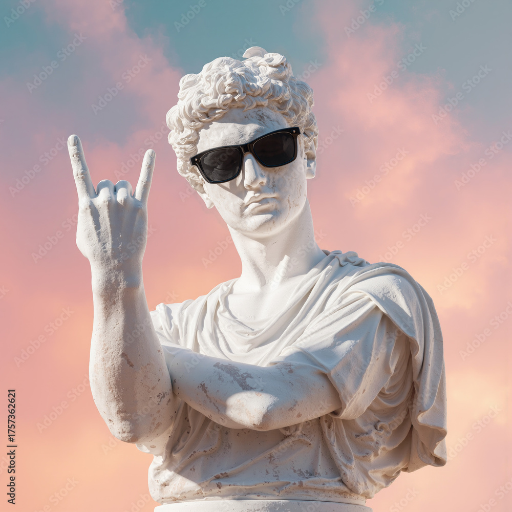 Statue of a man in white marble wearing black sunglasses and making a hand gesture against a colorful sky during sunset #1757362621