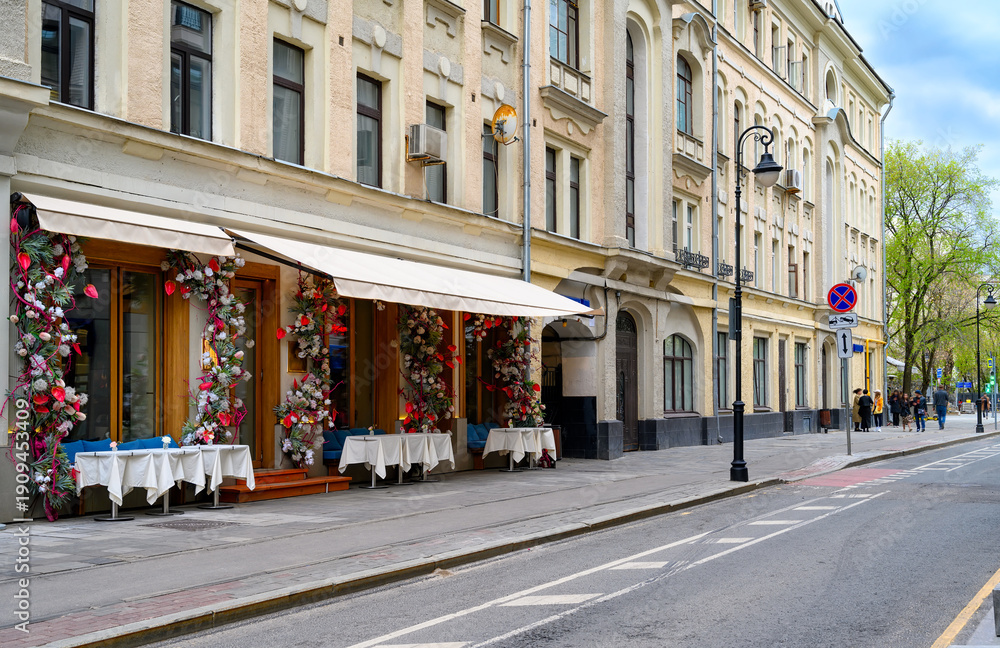 Street with tables of cafe in center of Moscow in Russia. Cozy cityscape in Moscow. Architecture and landmarks of Moscow. #1909453409
