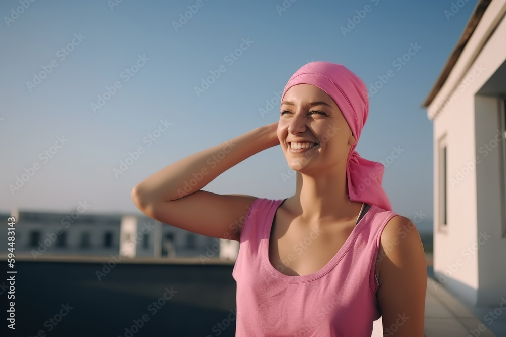 Strong woman wearing pink t-shirt and headscarf, breast cancer cancer survivor concept. Generative AI #594483143