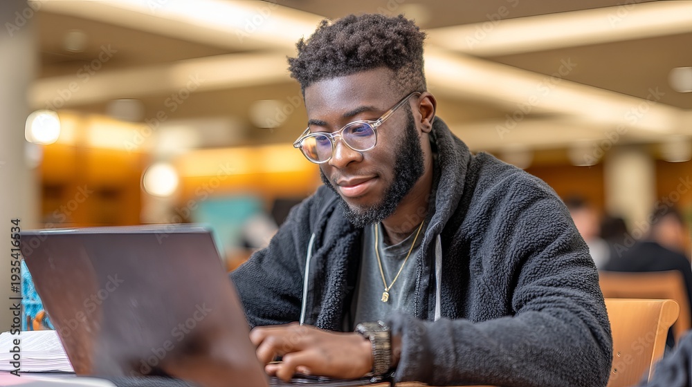 Student types on laptop in library for studies or research. Man also prepares for college work. #1935416534