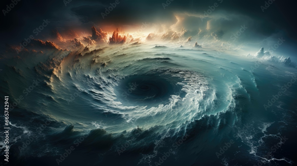 stunning satellite imagery revealing a colossal hurricane, with its eye and spiral arms clearly visible, showcasing the breathtaking and terrifying beauty of nature’s fury. Ai generated #665742941