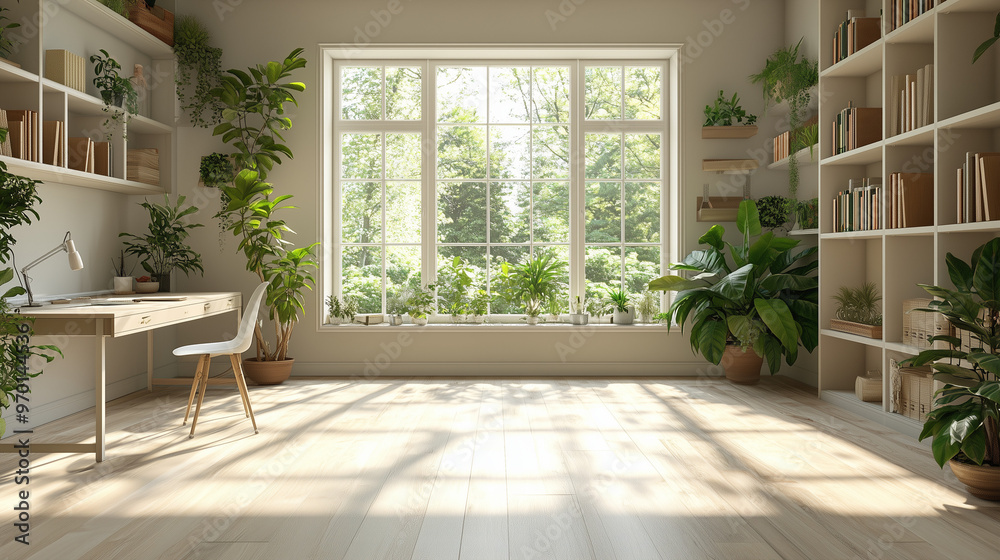 Sunny office/home space with a large window, white walls, bookshelves, desk, and plants. Great as a Zoom background for calls #970144536
