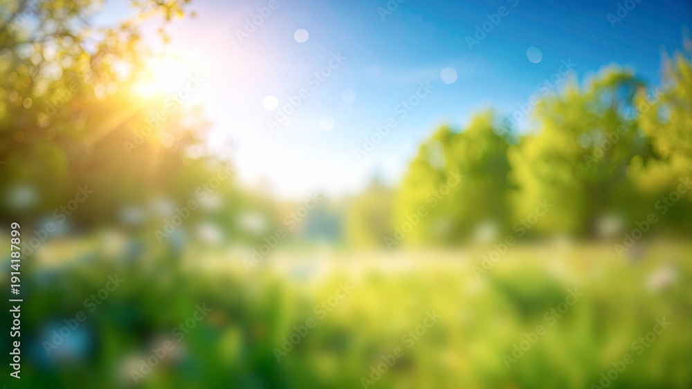 Sunny spring meadow blur background, blue sky and green grass #1914187899