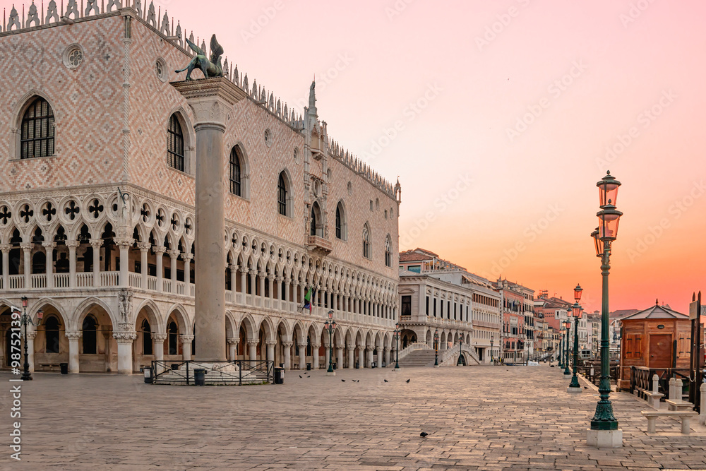 Sunrise view of piazza San Marco, Doge Palace Palazzo Ducale in Venice, Italy. Architecture and landmark. Sunrise cityscape. Venice embankment. #987521397