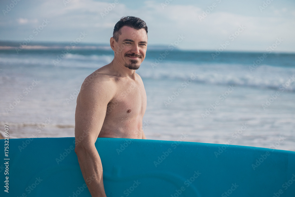 Surfer man learning to surf on foam in the ocean. First surfing lesson. Amateur surfer. Surfing training. Photo for surfing school advertising on social media. #1753226907