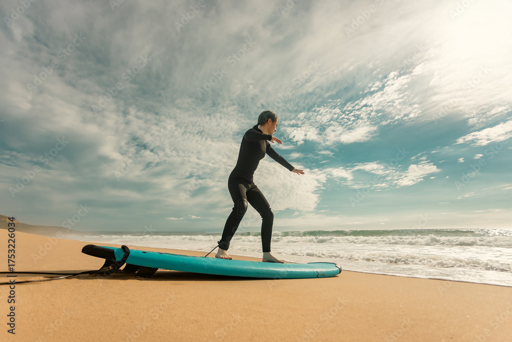 Surfer. Teenage girl learning to surf on foam in the ocean. First surfing lesson. Amateur surfer. Surfing training. Photo for surfing school advertising on social media. #1753226034