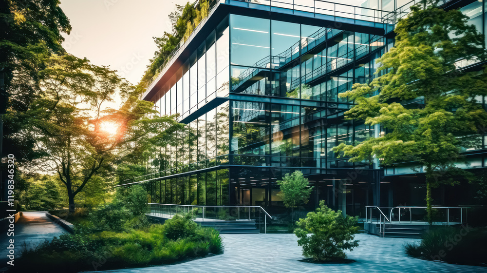 Sustainable green building eco friendly glass office with trees to reduce CO2. Standard illustration of a corporate building promoting a green environment. #1198346320
