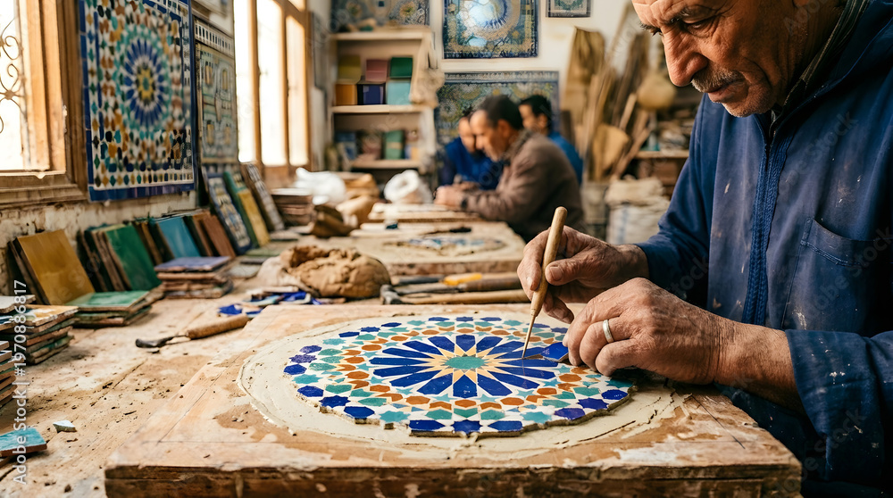 Talented Artisan Creating Intricate Hand-Painted Ceramic Mosaic in Workshop. #1970886817